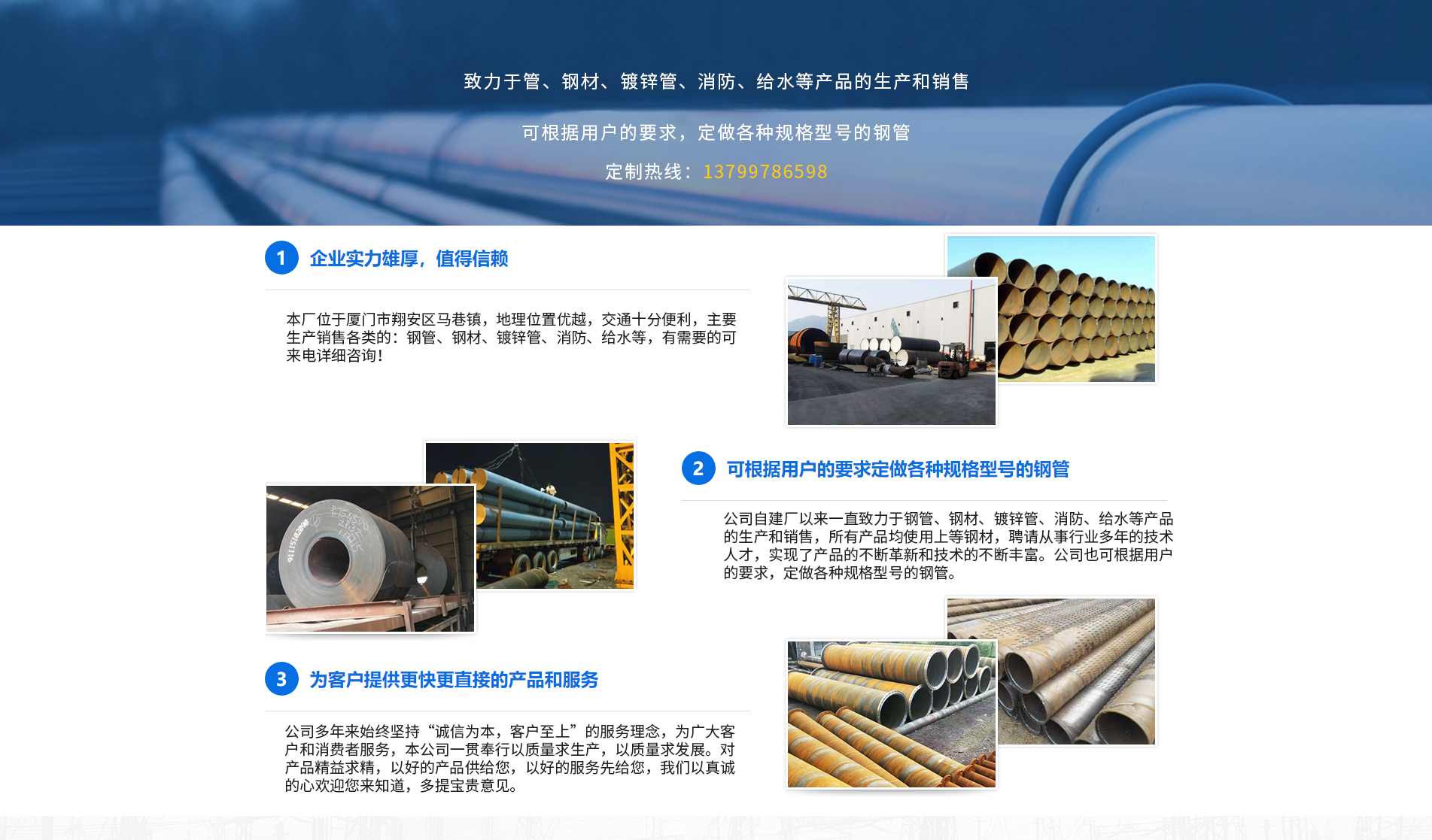 廈門方圓澤金屬材料有限公司主要生產(chǎn)銷售各類銀澤的:鋼管、鋼材、鍍鋅管、消防、給水等,產(chǎn)品被廣泛應(yīng)用于天然氣、石油、化工、電力、熱力管網(wǎng)、水源等長(zhǎng)距離輸送管道等,公司建立起了產(chǎn)品售前、售后服務(wù)規(guī)范,全過(guò)程滿足顧客要求,使我們的產(chǎn)品和服務(wù)深得顧客的信賴,與顧客建立起了長(zhǎng)期合作互利關(guān)系。
